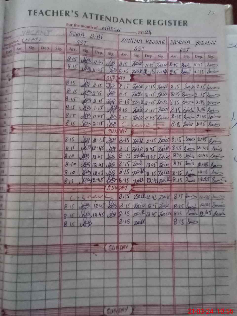 | CNIC | Full Name | Designation | R/C | Absence During Last Calender Month |
