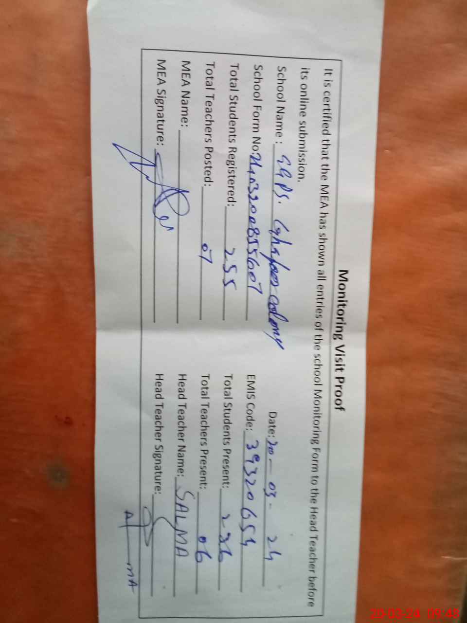| Attendance Register | Head Teacher | MEA with School | Visit Proof |