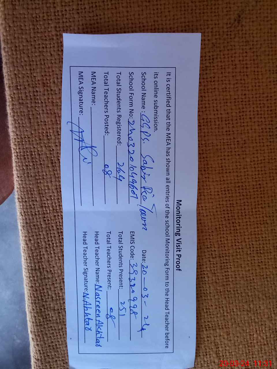 | Attendance Register | Head Teacher | MEA with School | Visit Proof |