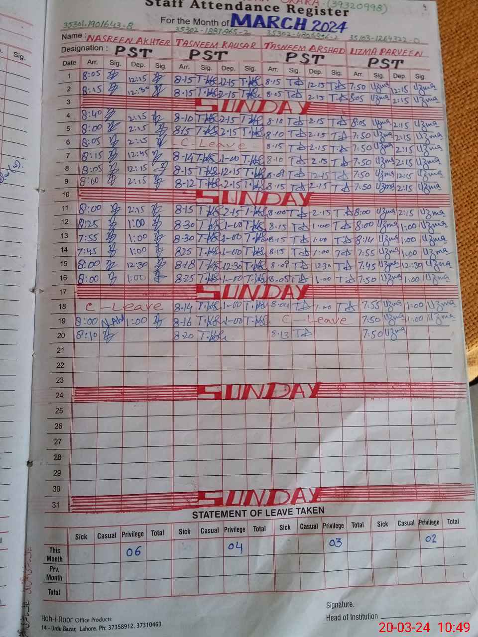 | CNIC | Full Name | Designation | R/C | Absence During Last Calender Month |