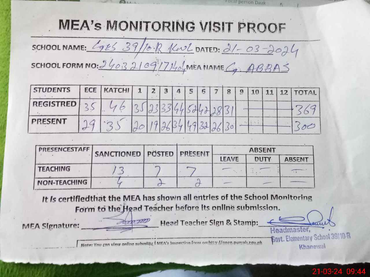 | Certified that this School was Inspected by the Undersigned MEA/DMO Today and the Information Stated Above is as Per Record. | |||||