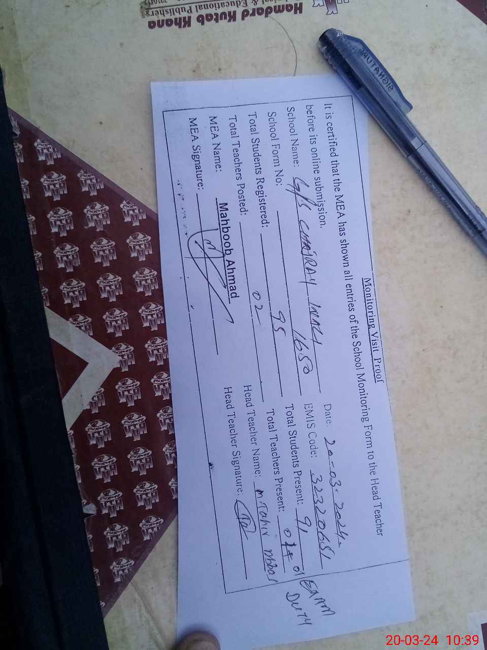 | Attendance Register | Head Teacher | MEA with School | Visit Proof |