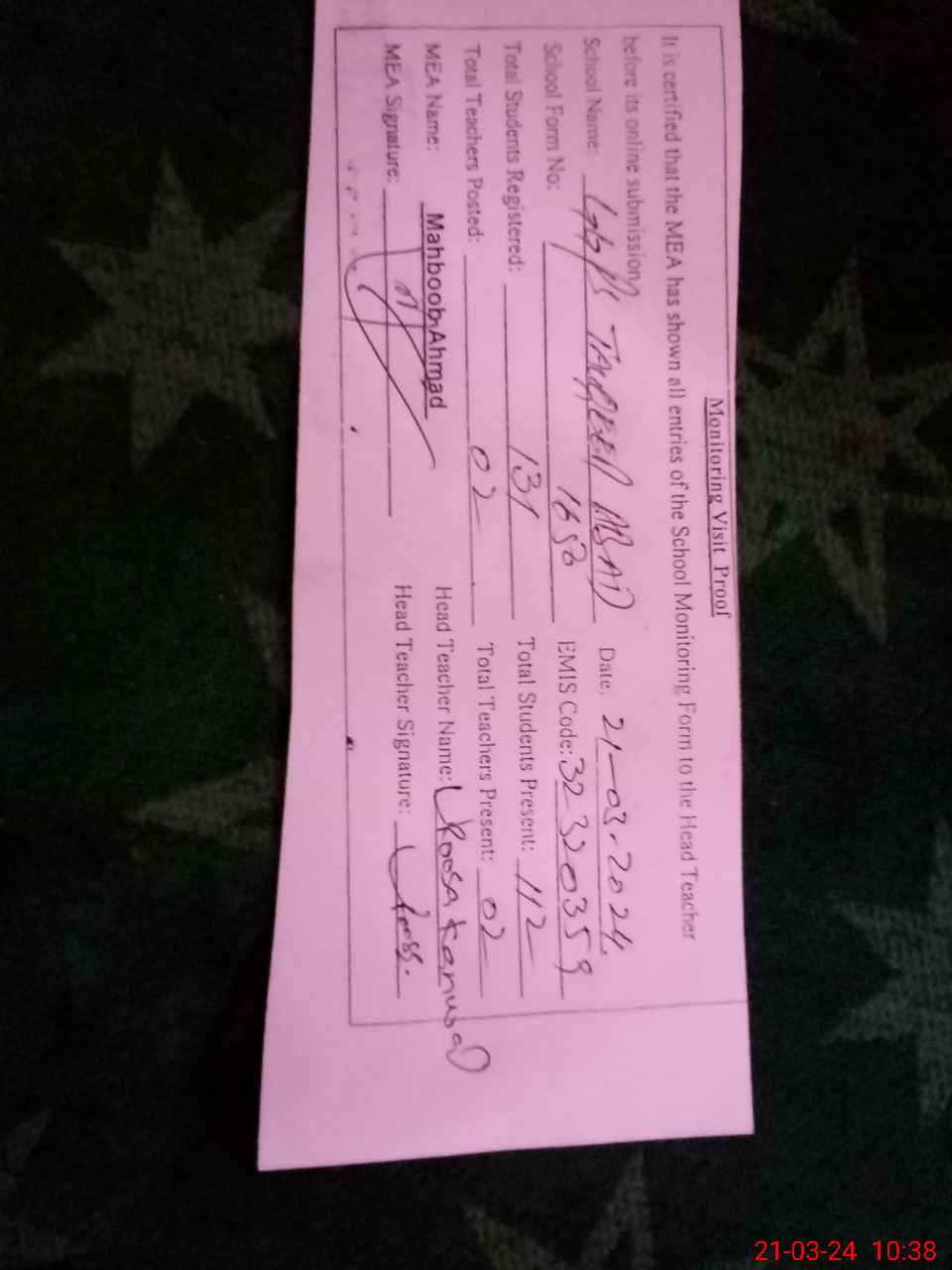 | Certified that this School was Inspected by the Undersigned MEA/DMO Today and the Information Stated Above is as Per Record. | |||||