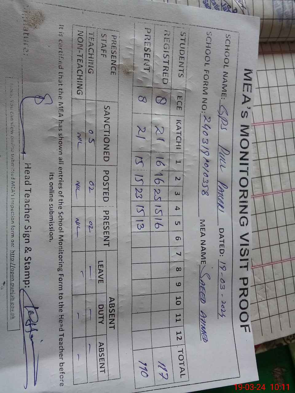 | Attendance Register | Head Teacher | MEA with School | Visit Proof |