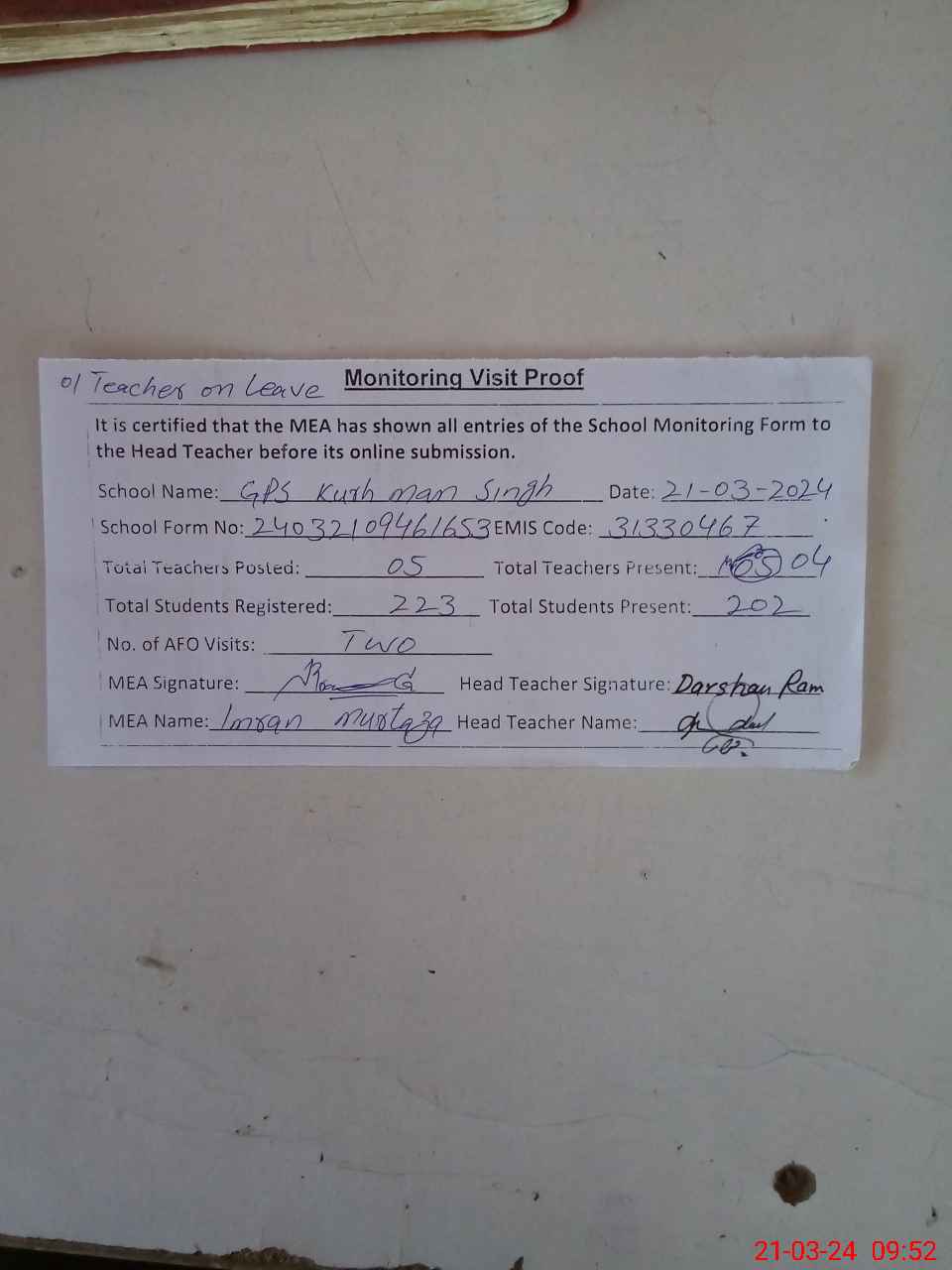 | Attendance Register | Head Teacher | MEA with School | Visit Proof |