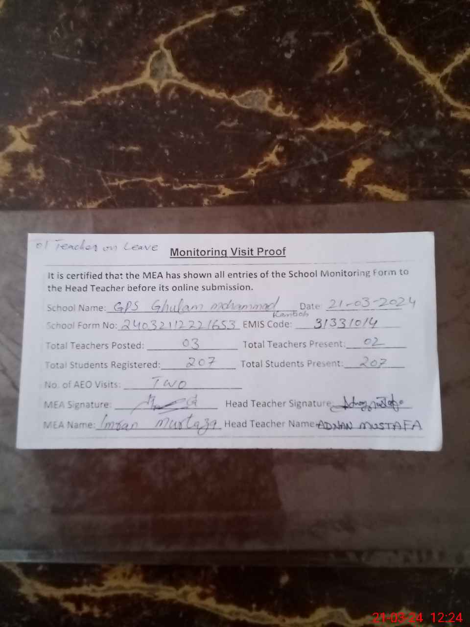 | Attendance Register | Head Teacher | MEA with School | Visit Proof |