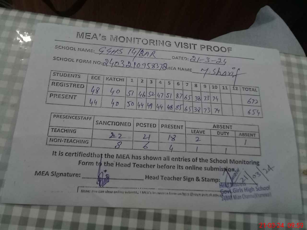 | Attendance Register | Head Teacher | MEA with School | Visit Proof |