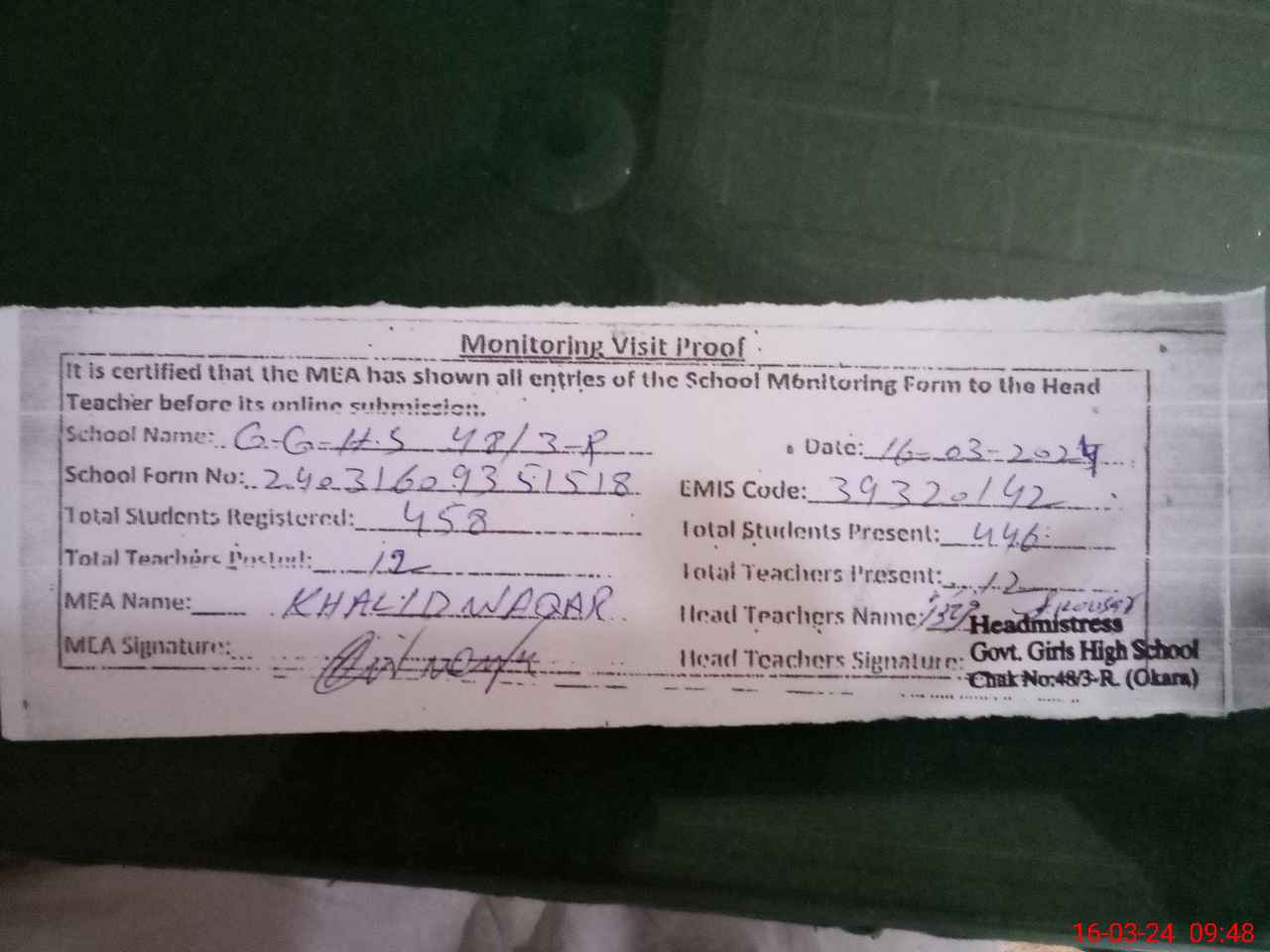 | Attendance Register | Head Teacher | MEA with School | Visit Proof |