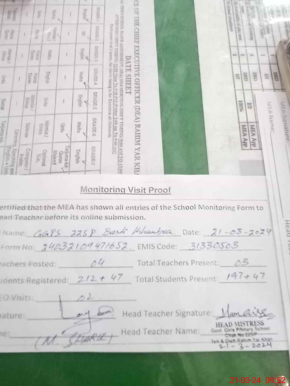 | Certified that this School was Inspected by the Undersigned MEA/DMO Today and the Information Stated Above is as Per Record. | |||||