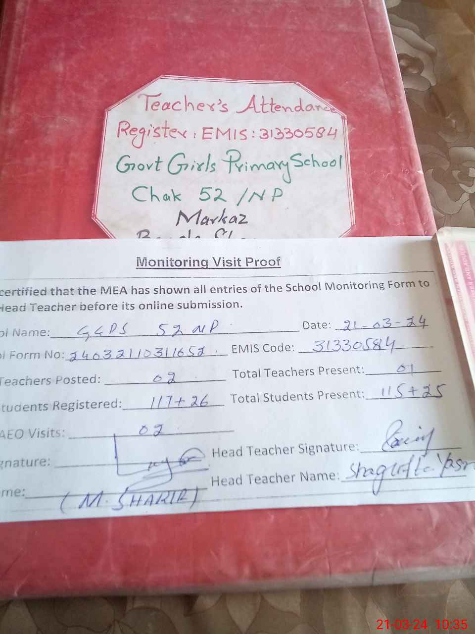 | Attendance Register | Head Teacher | MEA with School | Visit Proof |
