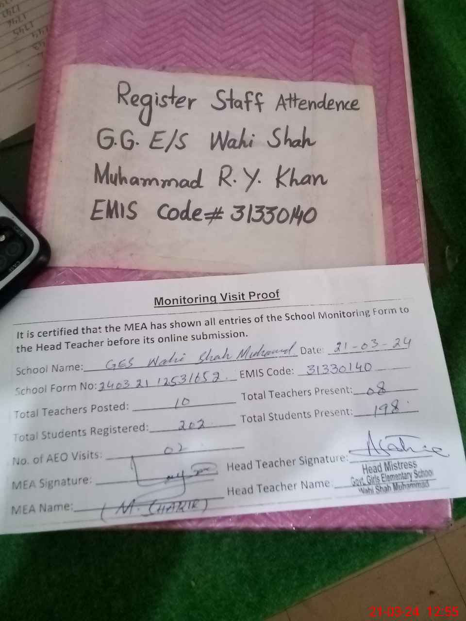 | Attendance Register | Head Teacher | MEA with School | Visit Proof |