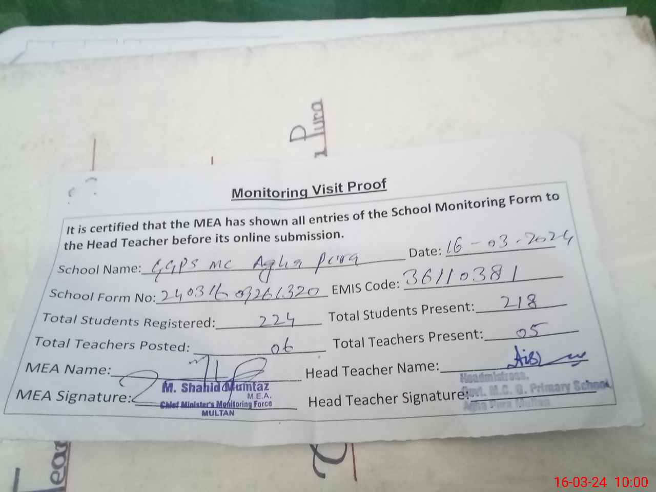 | Monitoring Date: 16-03-2024 | Start Time: 16-03-2024 09:26 AM | End Time: 16-03-2024 10:21 AM | Name of MEA: MU**** SH**** MU**** | |