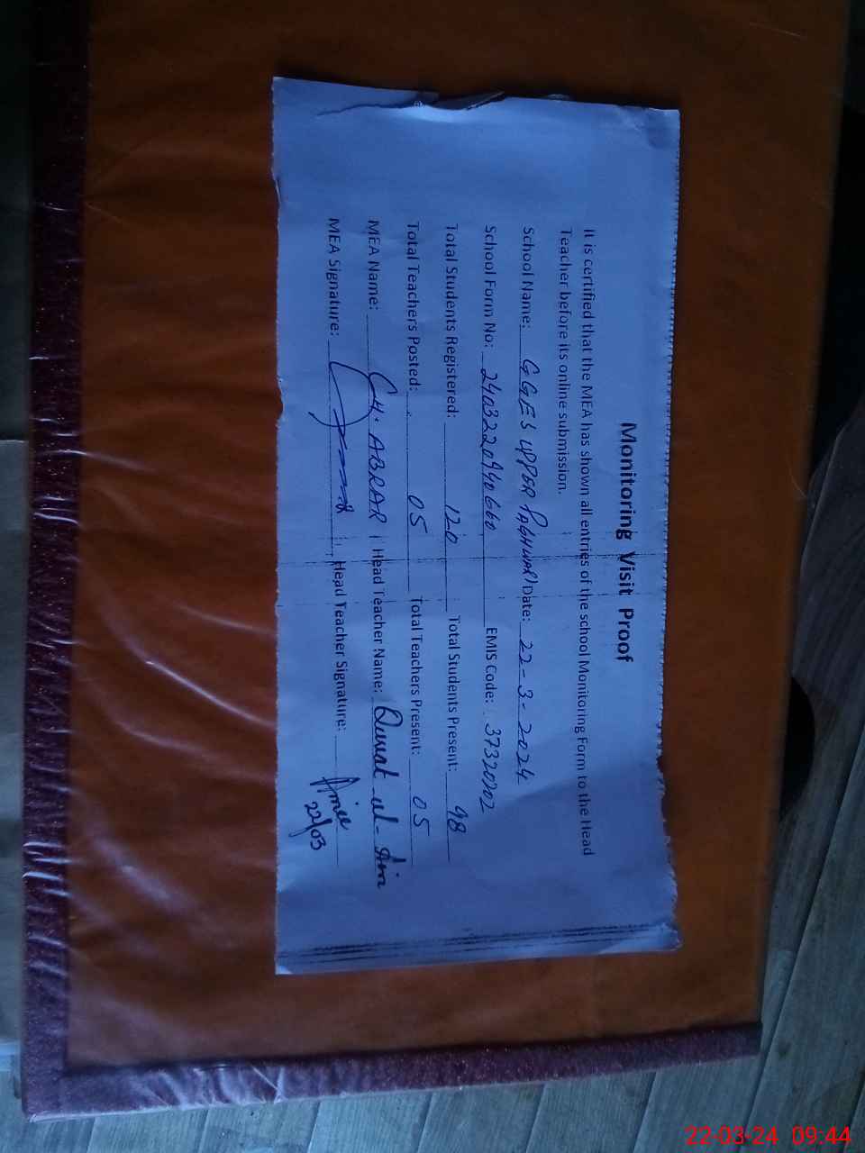 | Attendance Register | Head Teacher | MEA with School | Visit Proof |