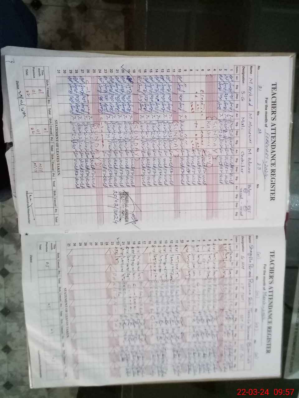 | Remarks (Use Separate Page if Required): 1 EST Humera Liaqat absent Wef 20 September 2023 to till date today on 22 2024 2 classes kachi one and Two are physically not present due to exams off | |||||