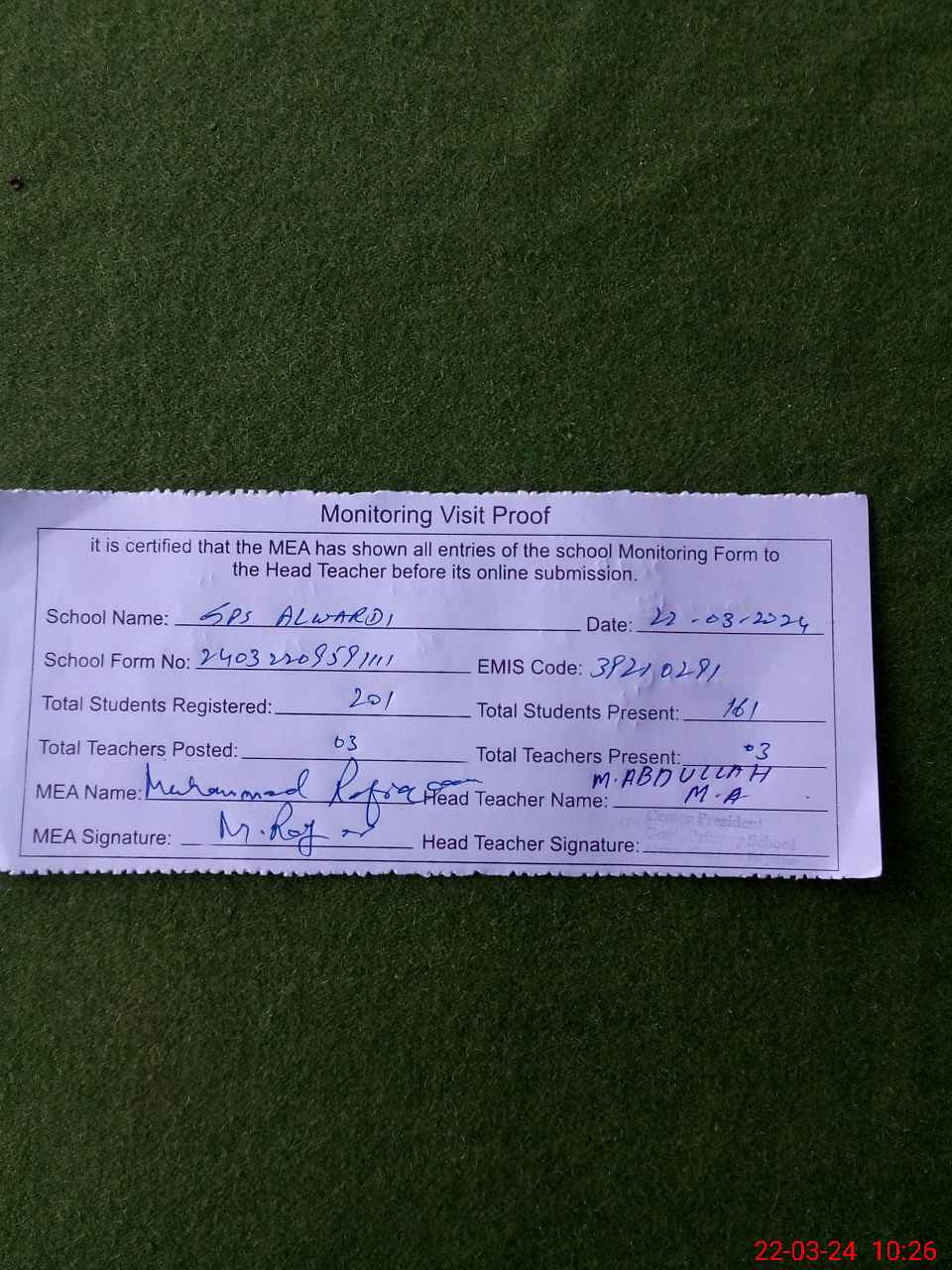 | EMIS Code: 39210291 | Name of School: GPS ALWARDI KHAN | |||