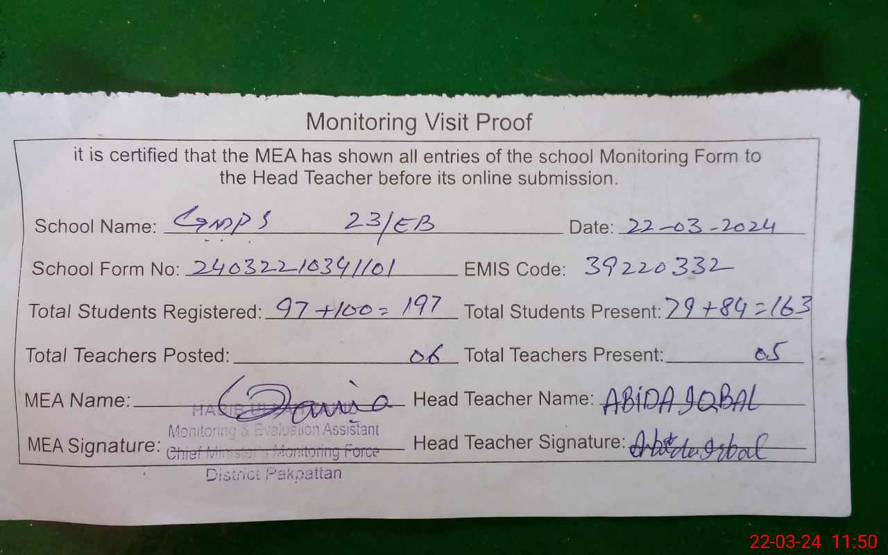| EMIS Code: 39220332 | Name of School: GMPS CHAK NO. 23 EB | |||