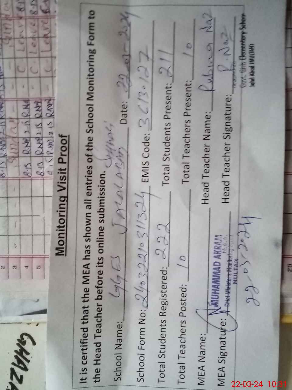 | Attendance Register | Head Teacher | MEA with School | Visit Proof |
