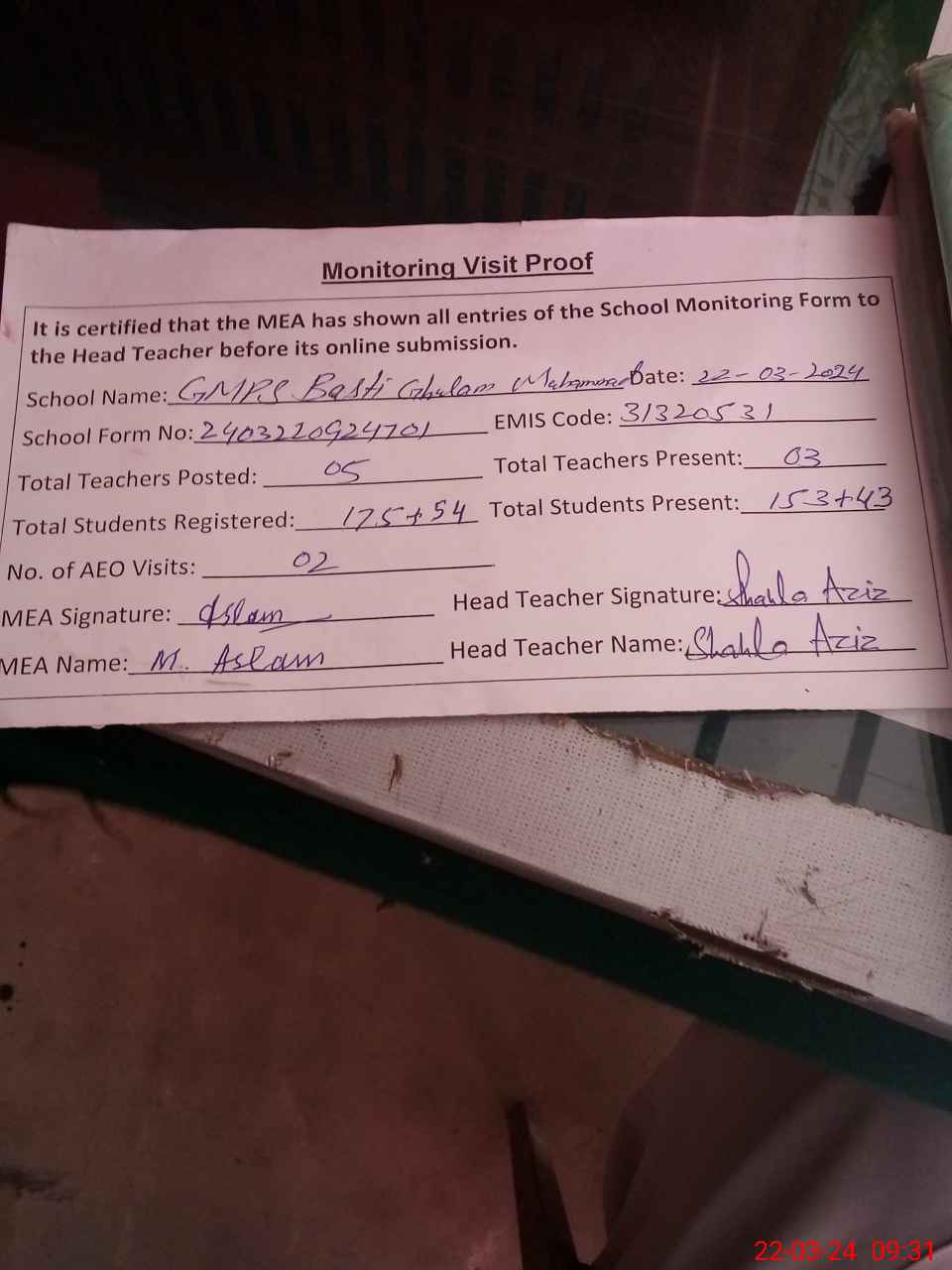 | EMIS Code: 31320531 | Name of School: GMPS BASTI GHULAM MUHAMMAD | |||