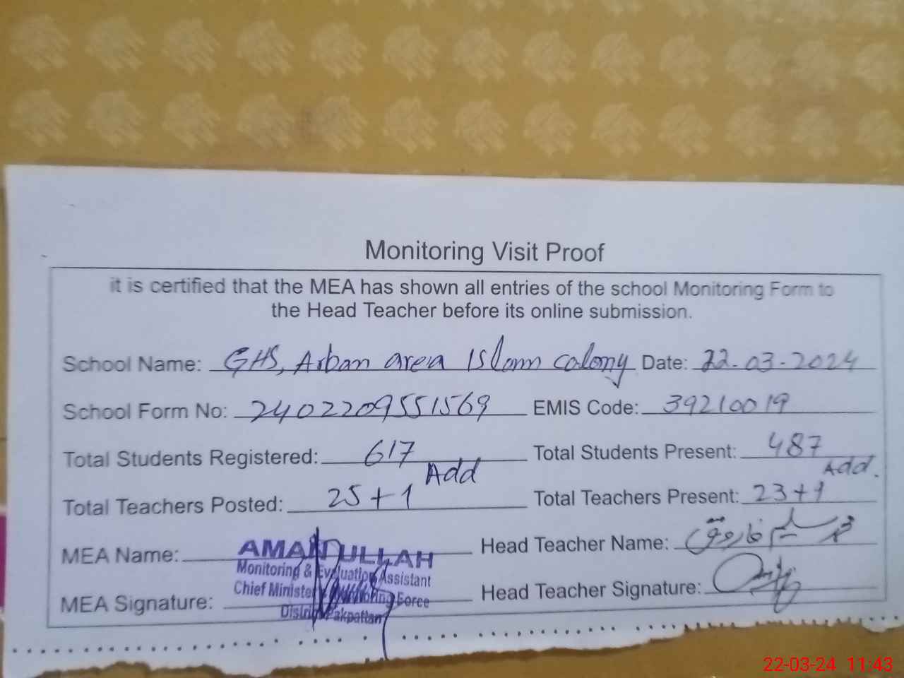 | Attendance Register | Head Teacher | MEA with School | Visit Proof |