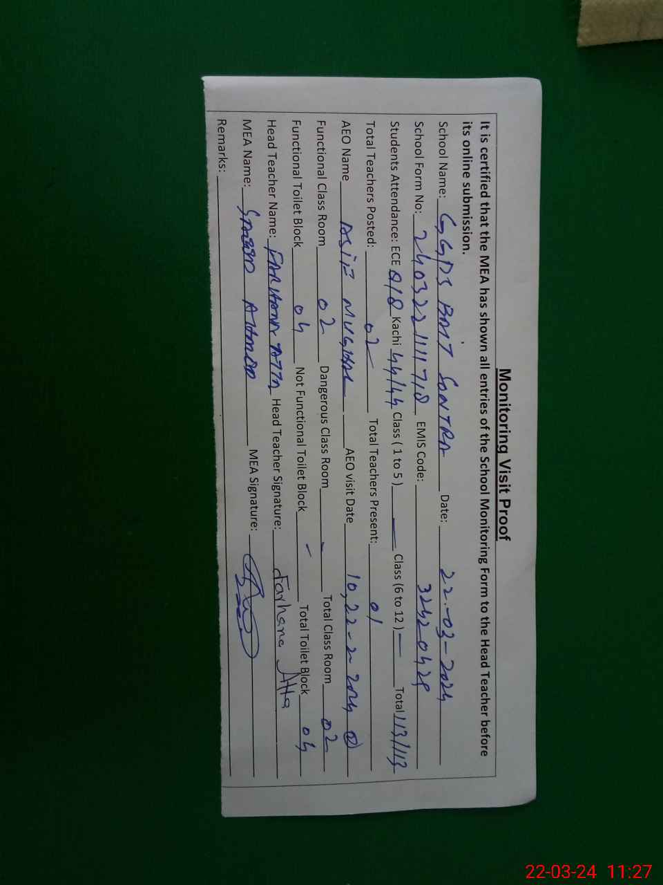 | Attendance Register | Head Teacher | MEA with School | Visit Proof |