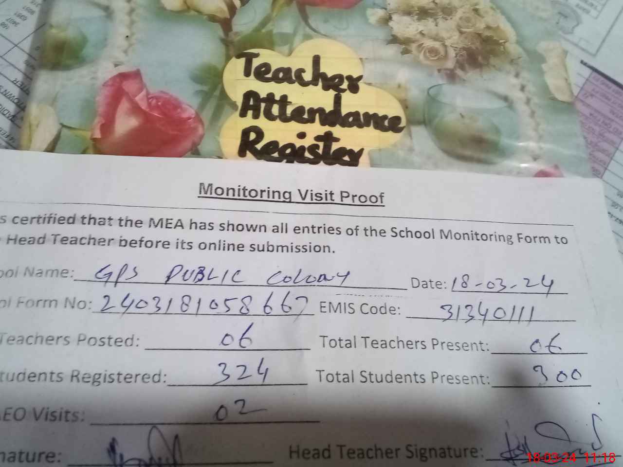| Attendance Register | Head Teacher | MEA with School | Visit Proof |