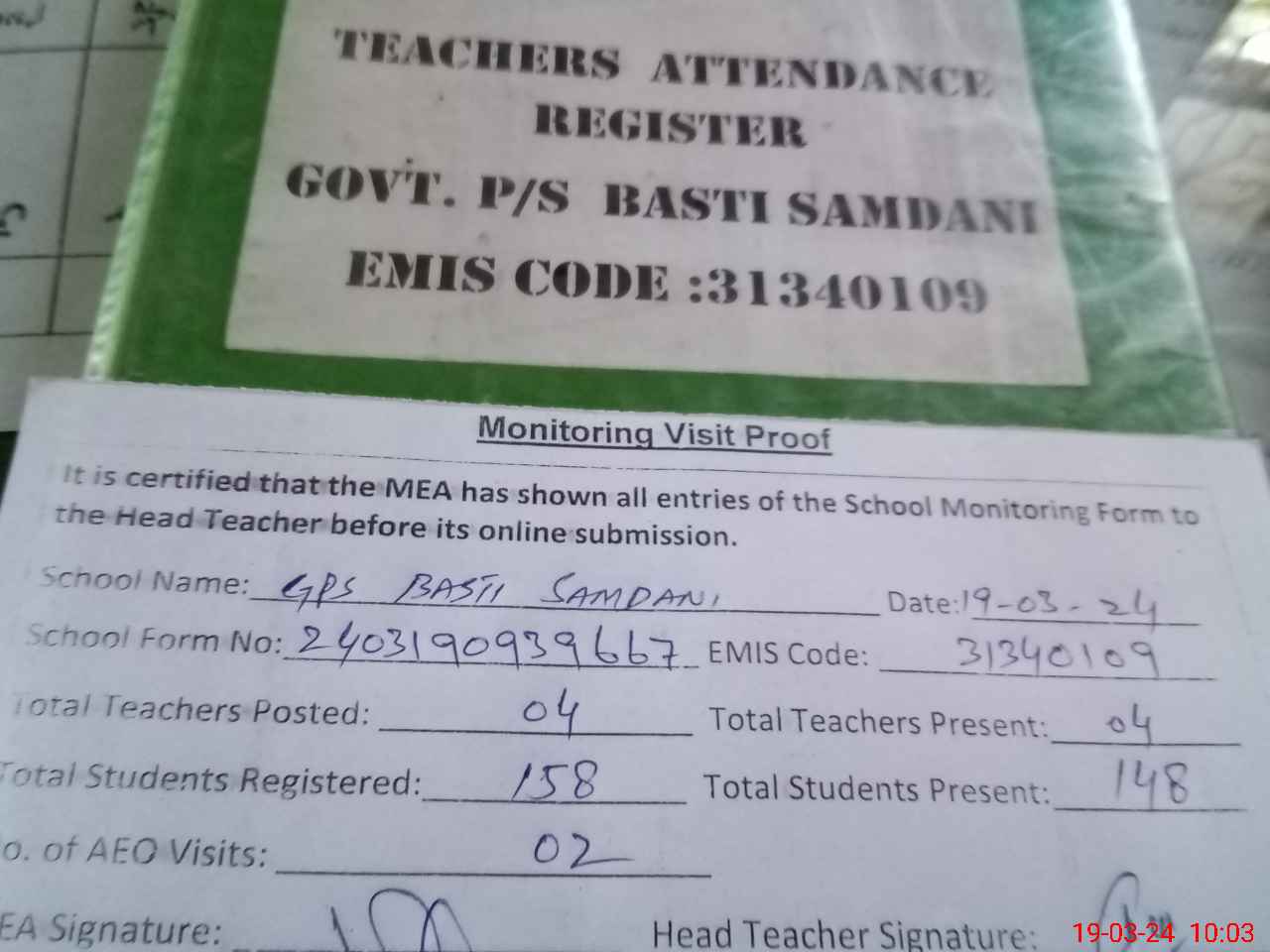 | Attendance Register | Head Teacher | MEA with School | Visit Proof |