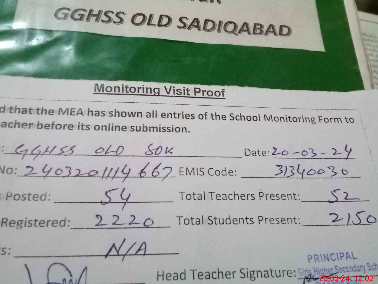 | Attendance Register | Head Teacher | MEA with School | Visit Proof |