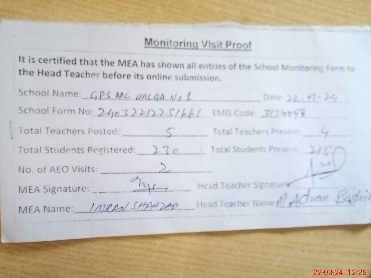 | EMIS Code: 31310098 | Name of School: GPS MC HALQA NO 1 | |||