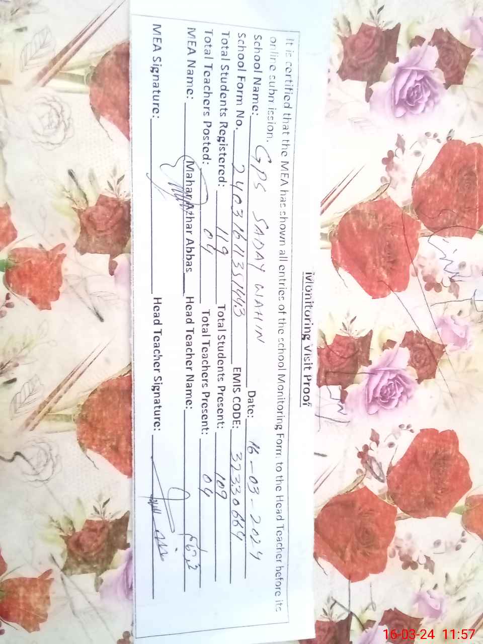 | EMIS Code: 32330664 | Name of School: GPS SADHAY WAHIN | |||