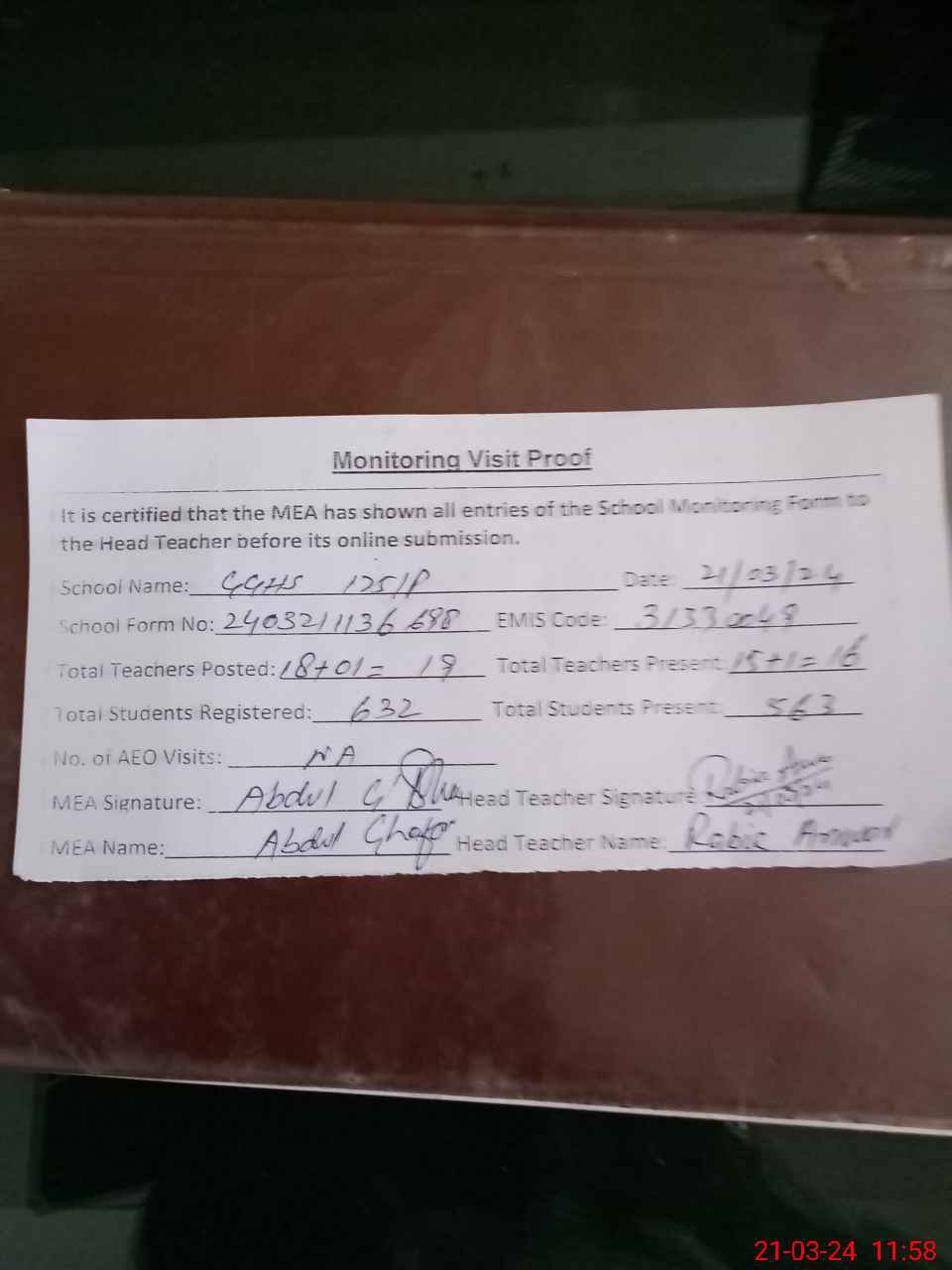 | Attendance Register | Head Teacher | MEA with School | Visit Proof |