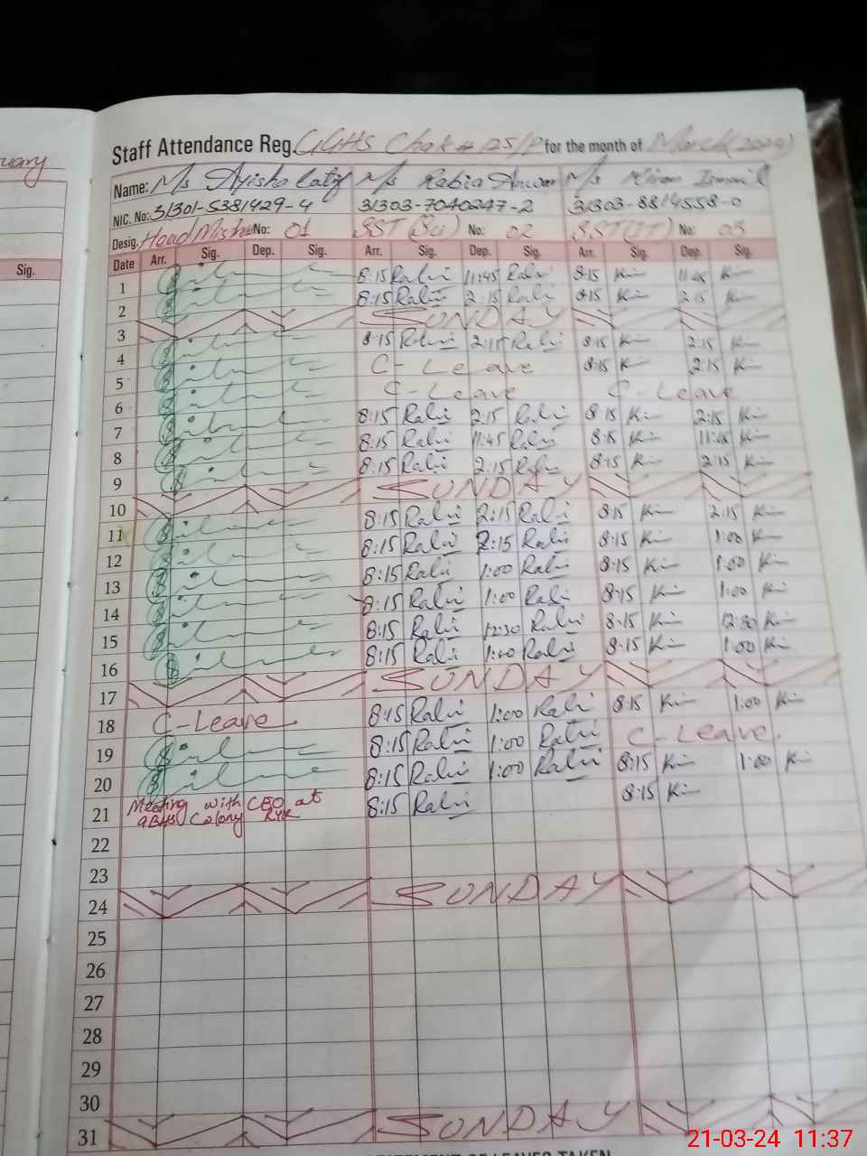 | CNIC | Full Name | Designation | R/C | Absence During Last Calender Month |