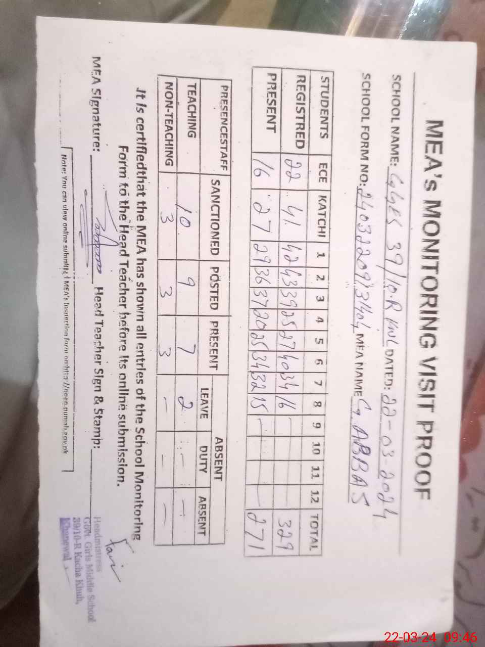 | Attendance Register | Head Teacher | MEA with School | Visit Proof |
