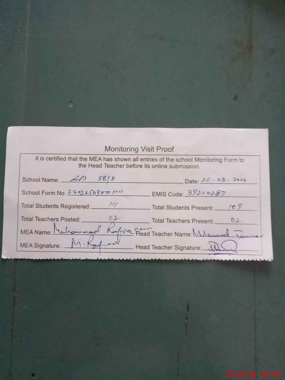 | Attendance Register | Head Teacher | MEA with School | Visit Proof |
