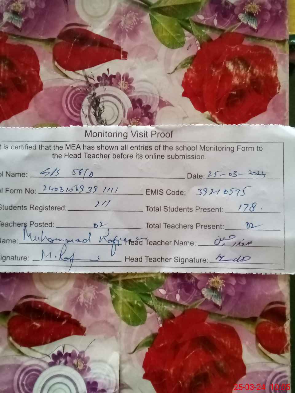 | Certified that this School was Inspected by the Undersigned MEA/DMO Today and the Information Stated Above is as Per Record. | |||||