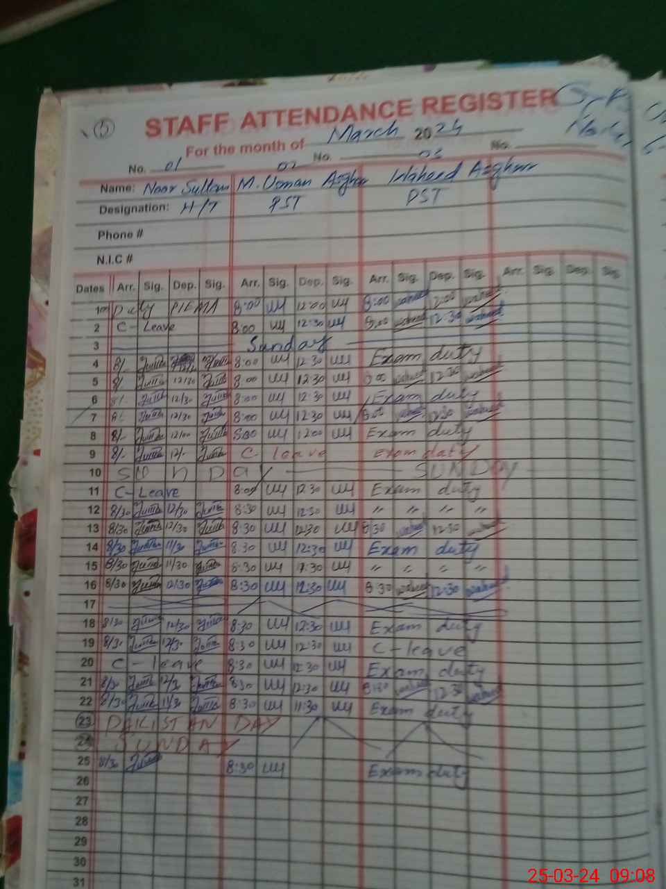 | 33**** | Wa**** As**** | 1 | 2 | 0 | 0 | 0 | 0 | 0 | 0 | 0 | 2 | Exam Duty | |