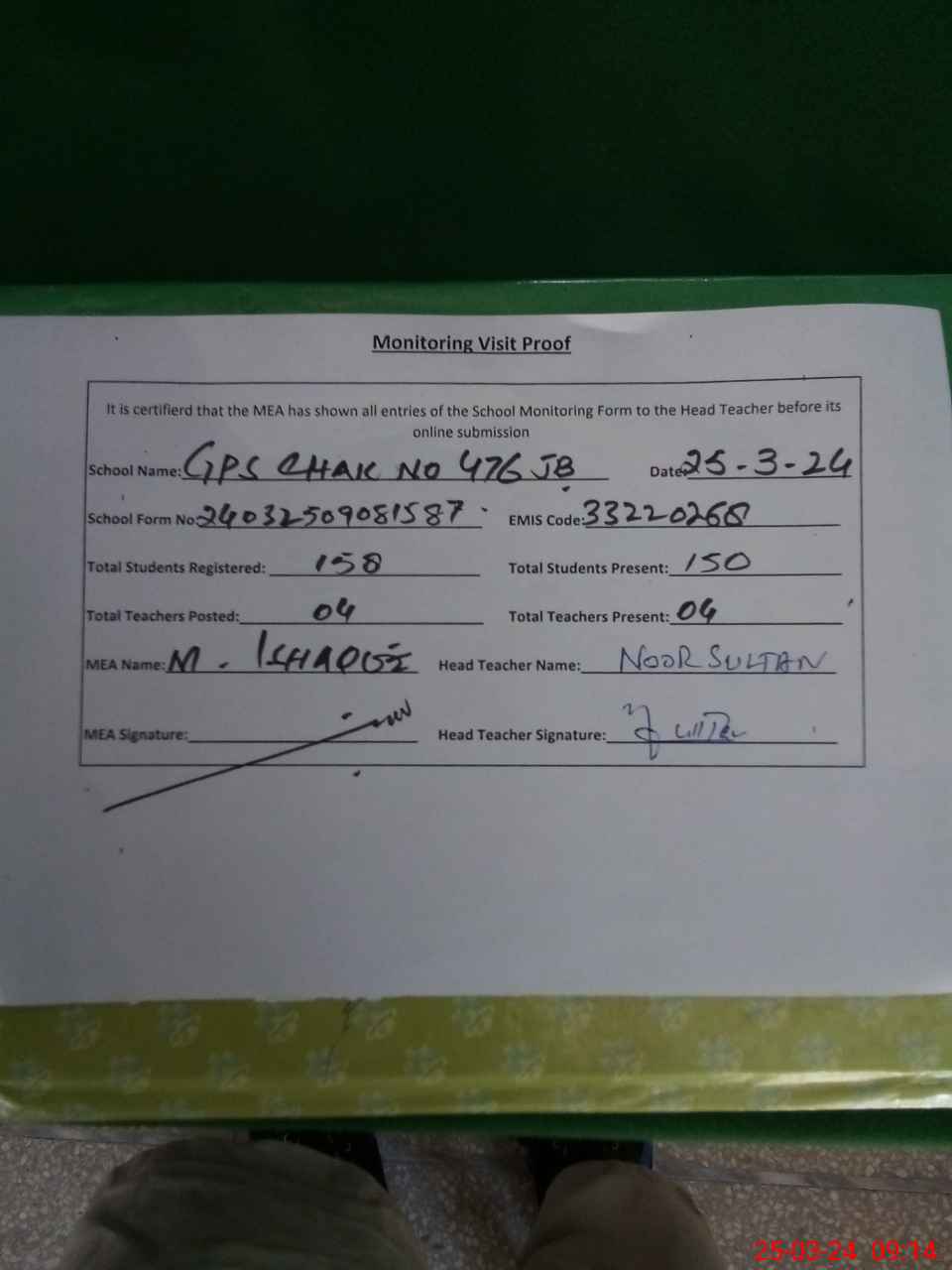 | EMIS Code: 33220268 | Name of School: GPS CHAK NO 476 JB | |||