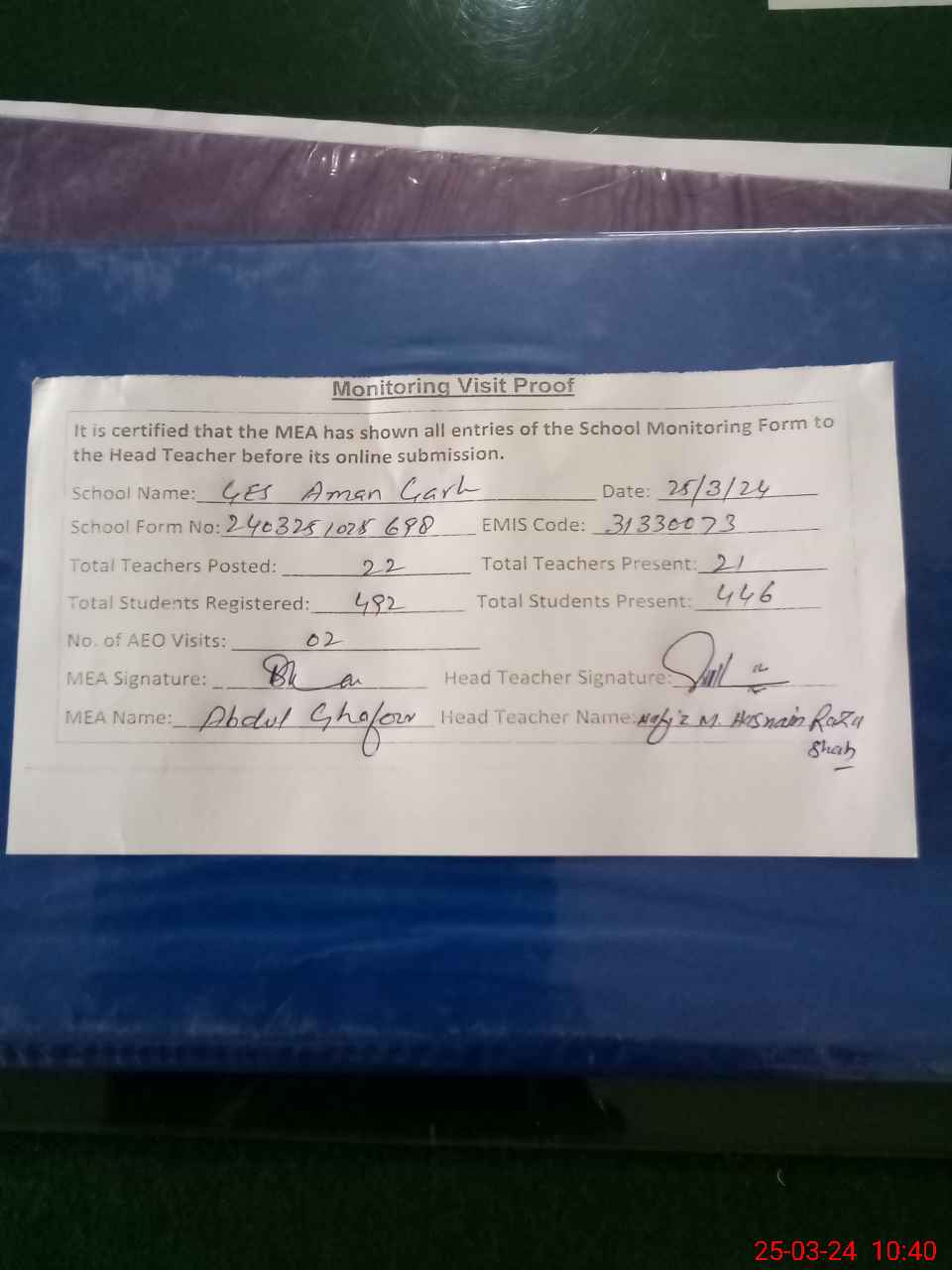 | Attendance Register | Head Teacher | MEA with School | Visit Proof |