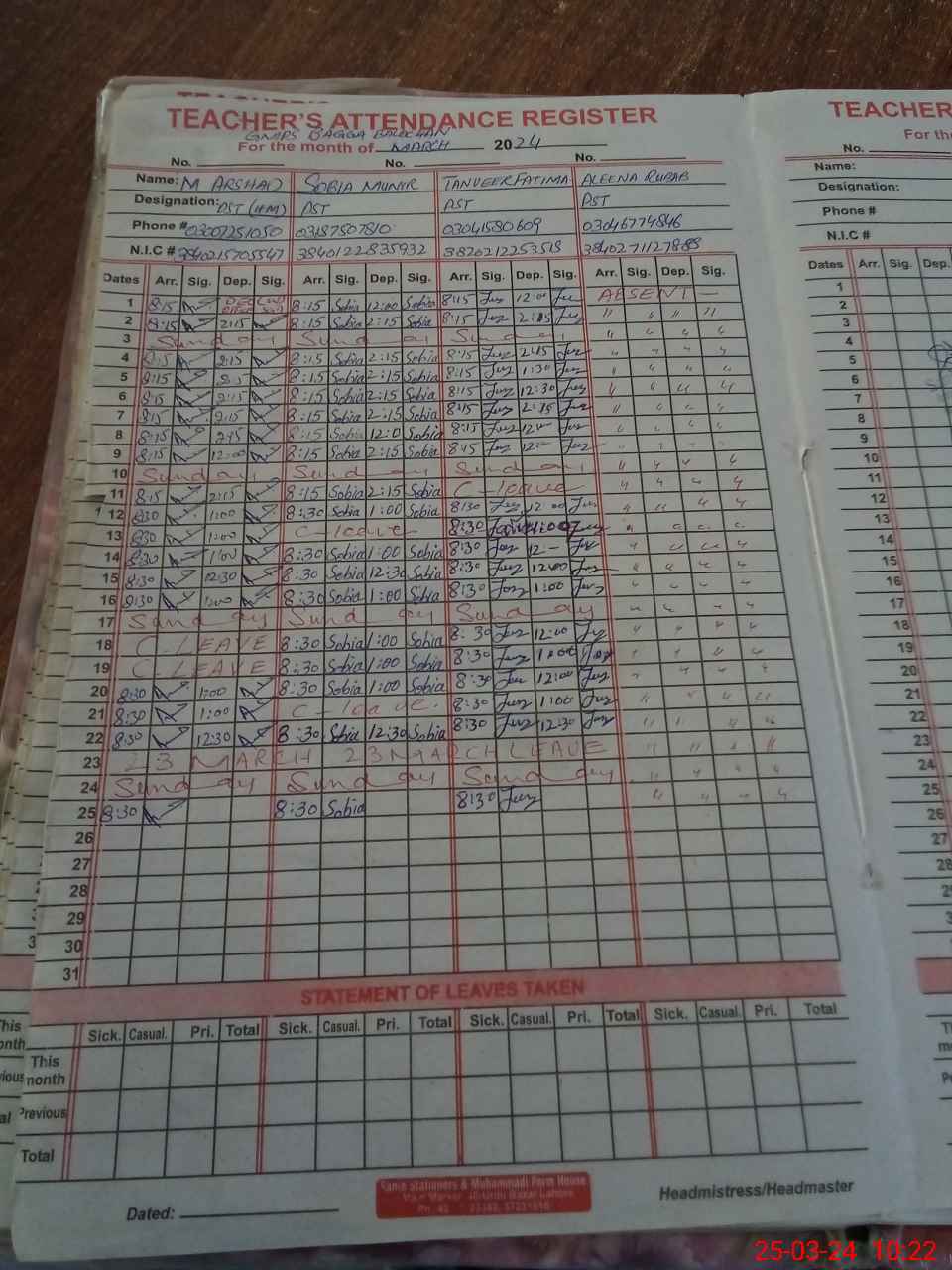 | CNIC | Full Name | Designation | R/C | Absence During Last Calender Month |