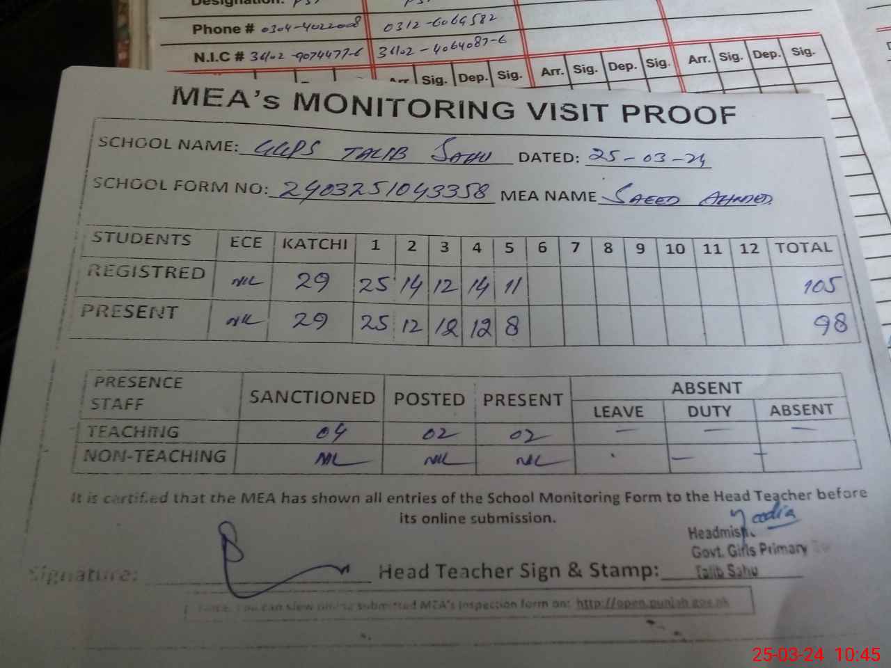 | Attendance Register | Head Teacher | MEA with School | Visit Proof |
