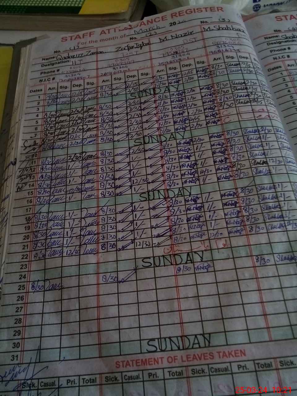 | CNIC | Full Name | Designation | R/C | Absence During Last Calender Month |