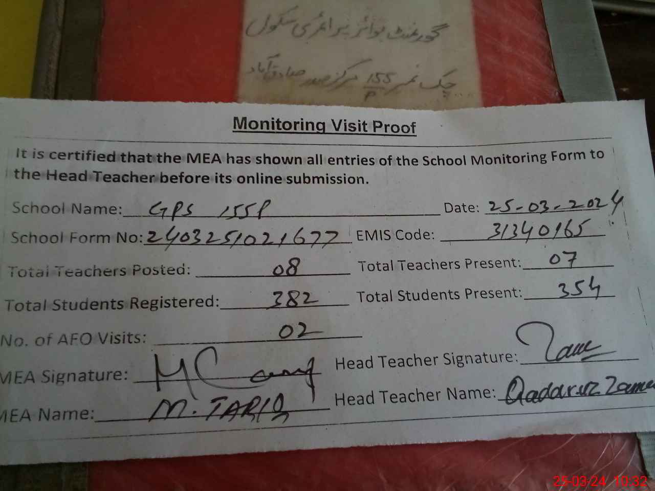 | Attendance Register | Head Teacher | MEA with School | Visit Proof |