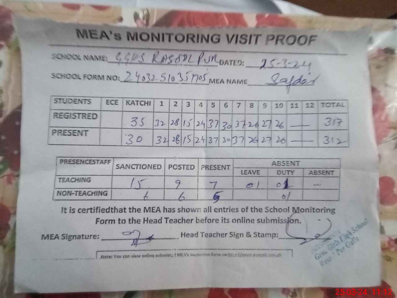 | Attendance Register | Head Teacher | MEA with School | Visit Proof |