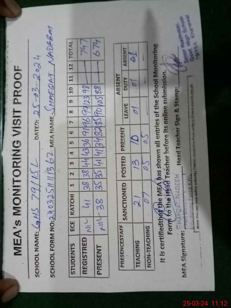 | Attendance Register | Head Teacher | MEA with School | Visit Proof |