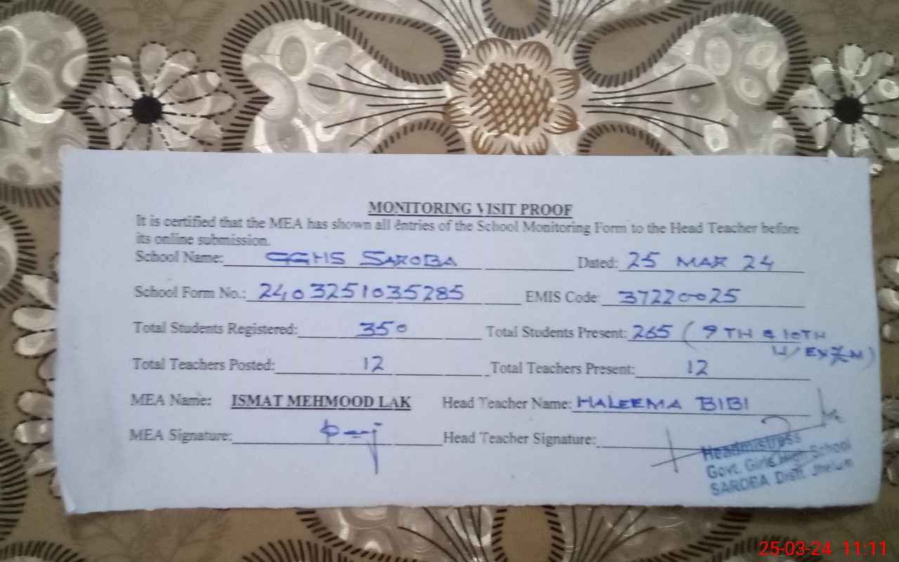 | Certified that this School was Inspected by the Undersigned MEA/DMO Today and the Information Stated Above is as Per Record. | |||||