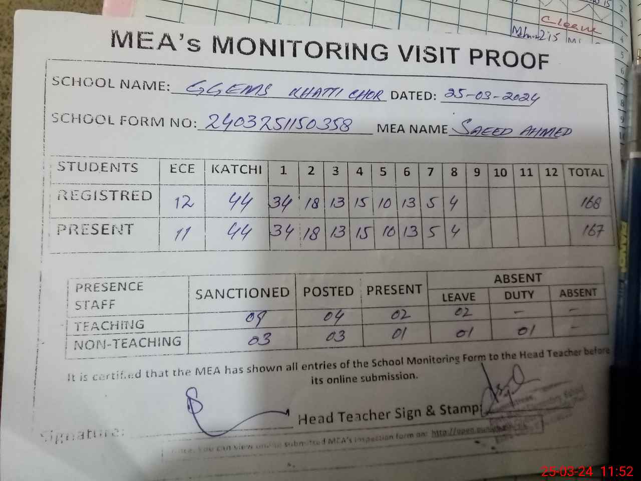 | Attendance Register | Head Teacher | MEA with School | Visit Proof |