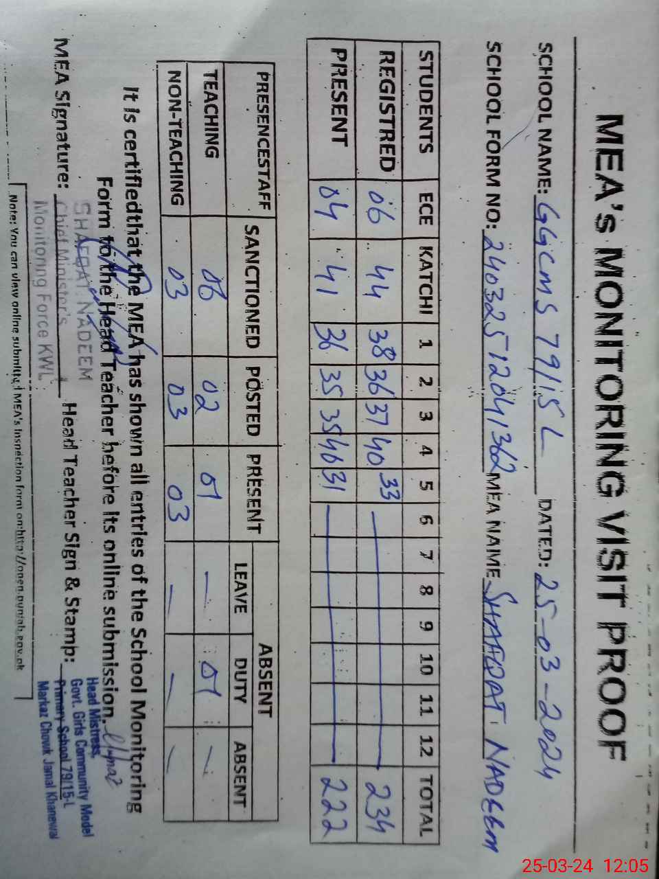| Certified that this School was Inspected by the Undersigned MEA/DMO Today and the Information Stated Above is as Per Record. | |||||