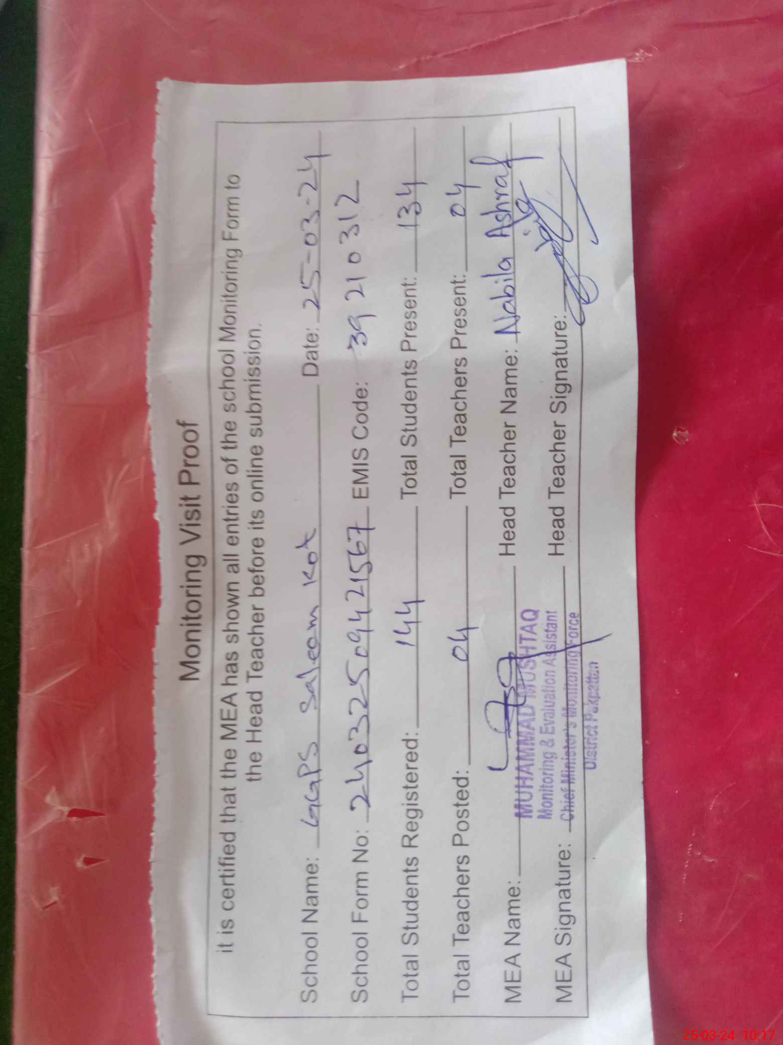 | EMIS Code: 39210312 | Name of School: GGPS SALEEM KOT | |||