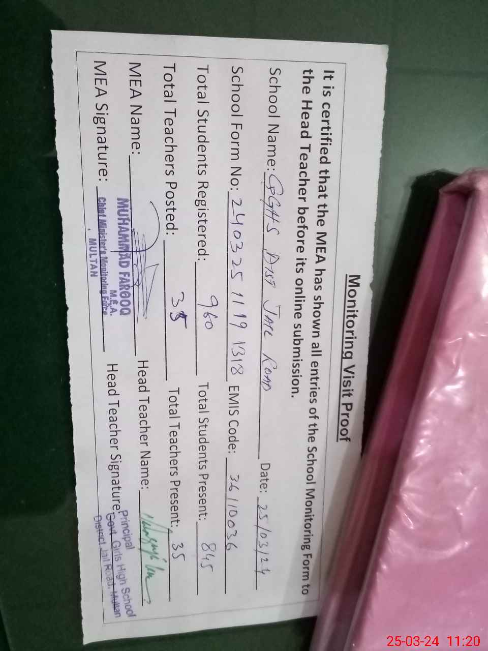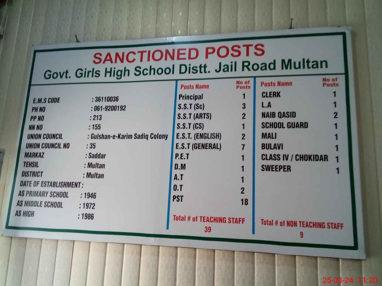 | EMIS Code: 36110036 | Name of School: GGHS DISTRICT JAIL ROAD MULTAN | |||