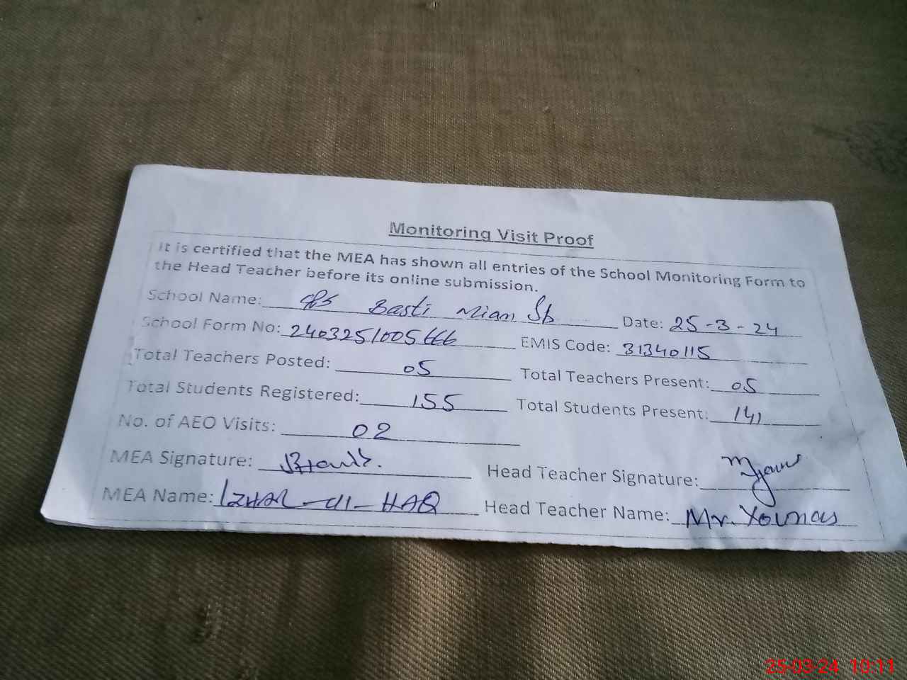 | Certified that this School was Inspected by the Undersigned MEA/DMO Today and the Information Stated Above is as Per Record. | |||||