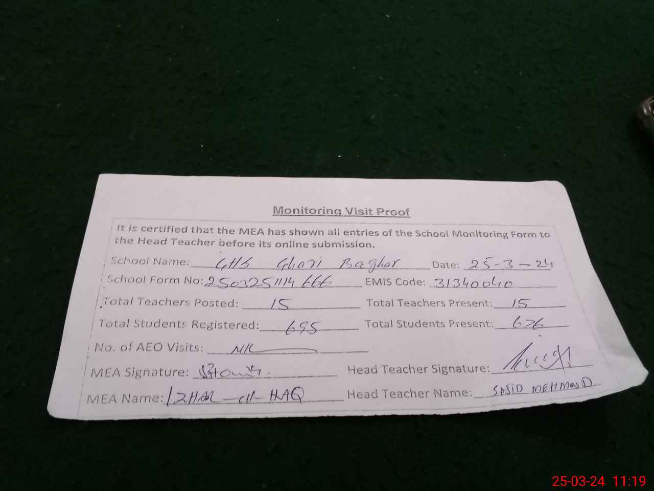 | Attendance Register | Head Teacher | MEA with School | Visit Proof |